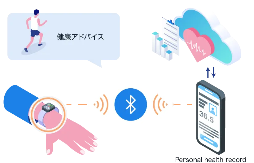 記録された健康データはクラウドに自動送信し、健康アドバイスや医療関連情報との連携も可能です。